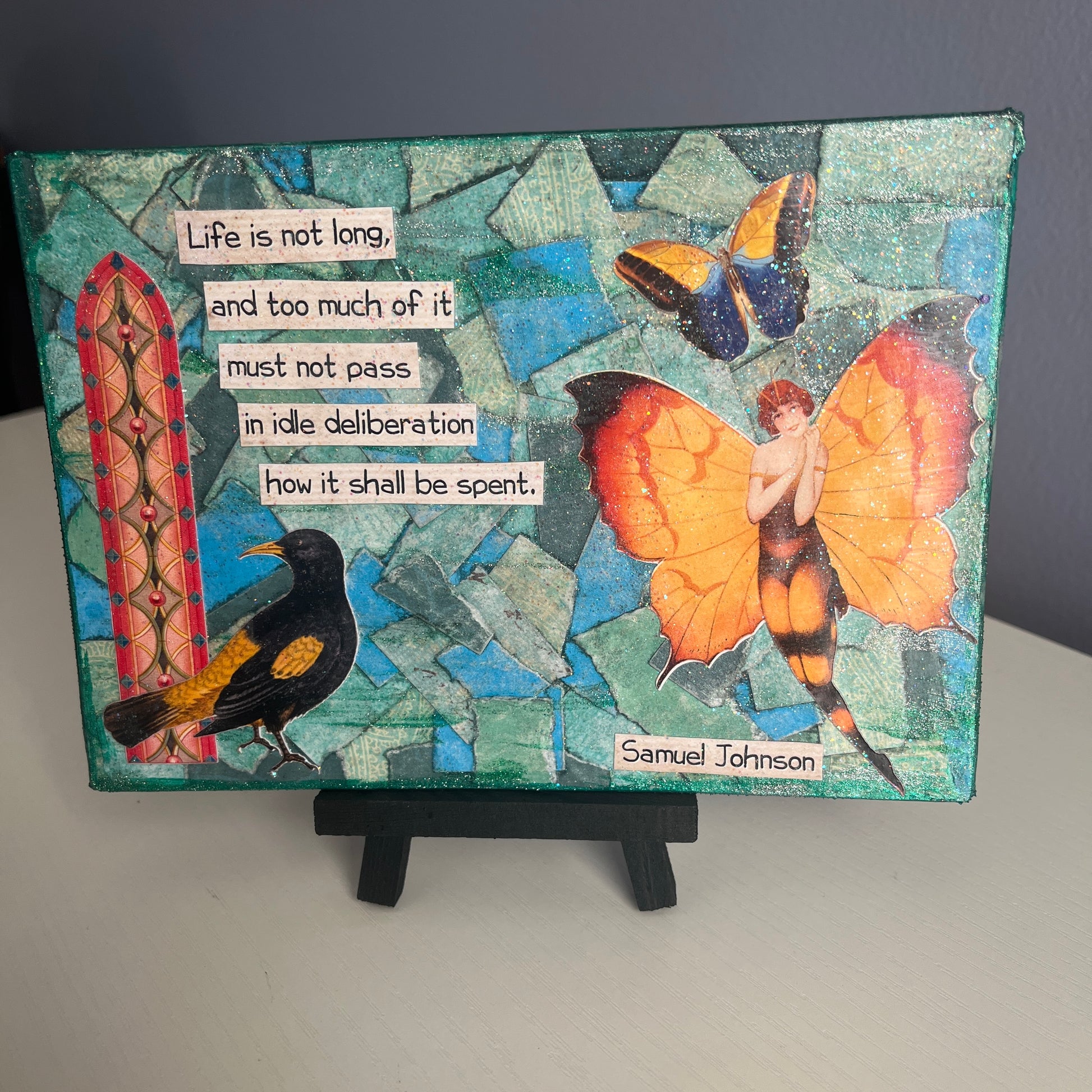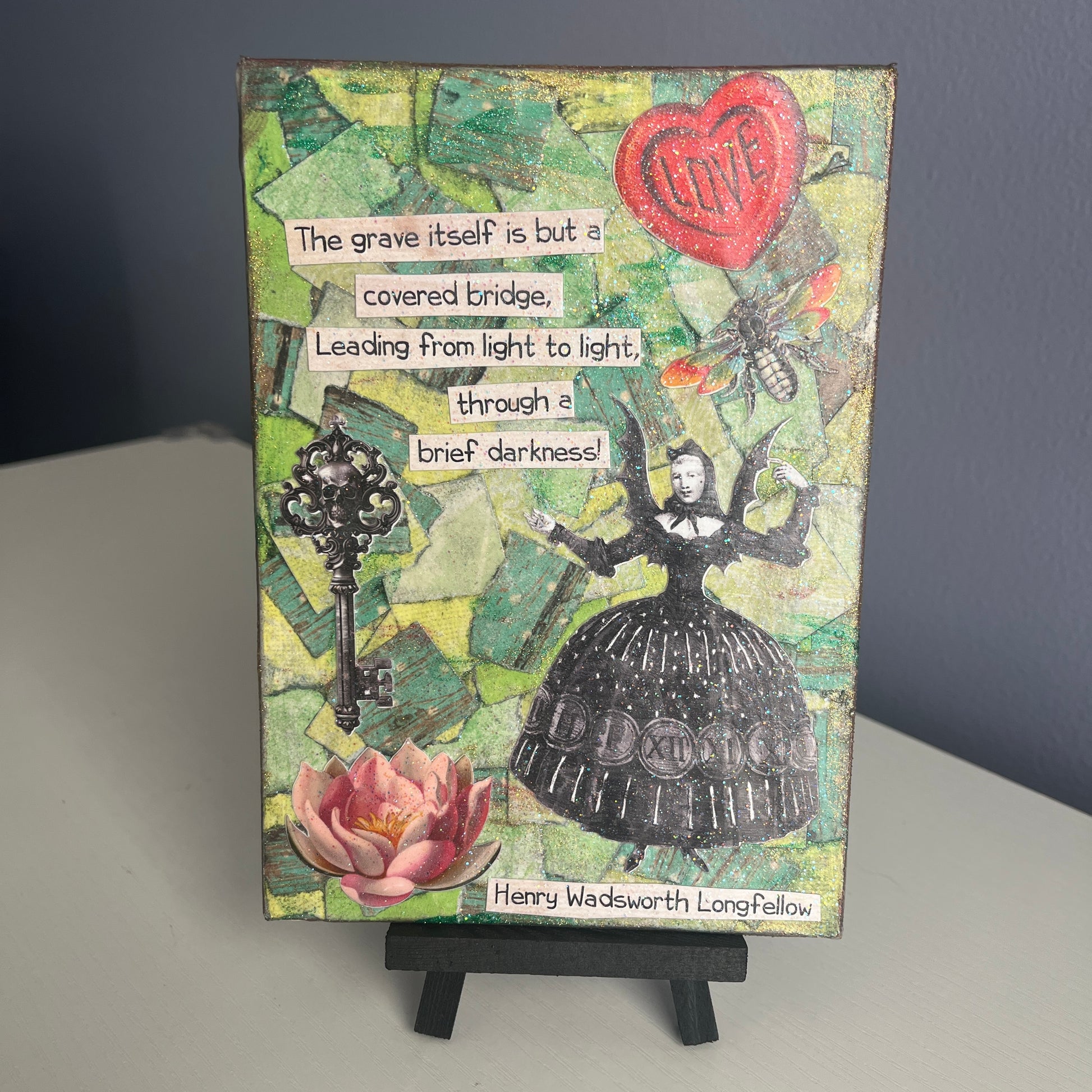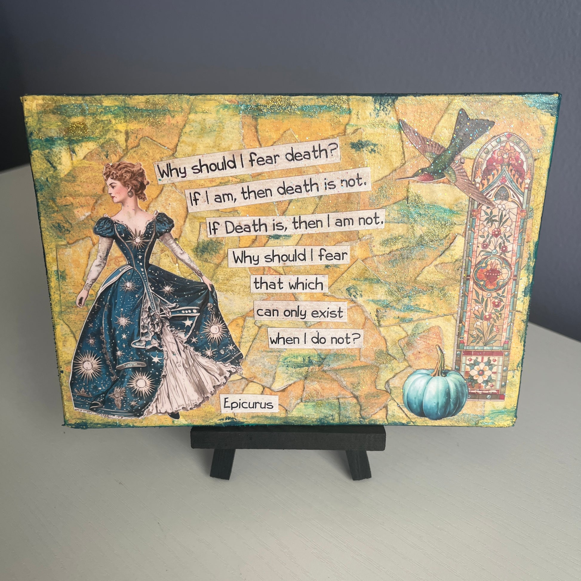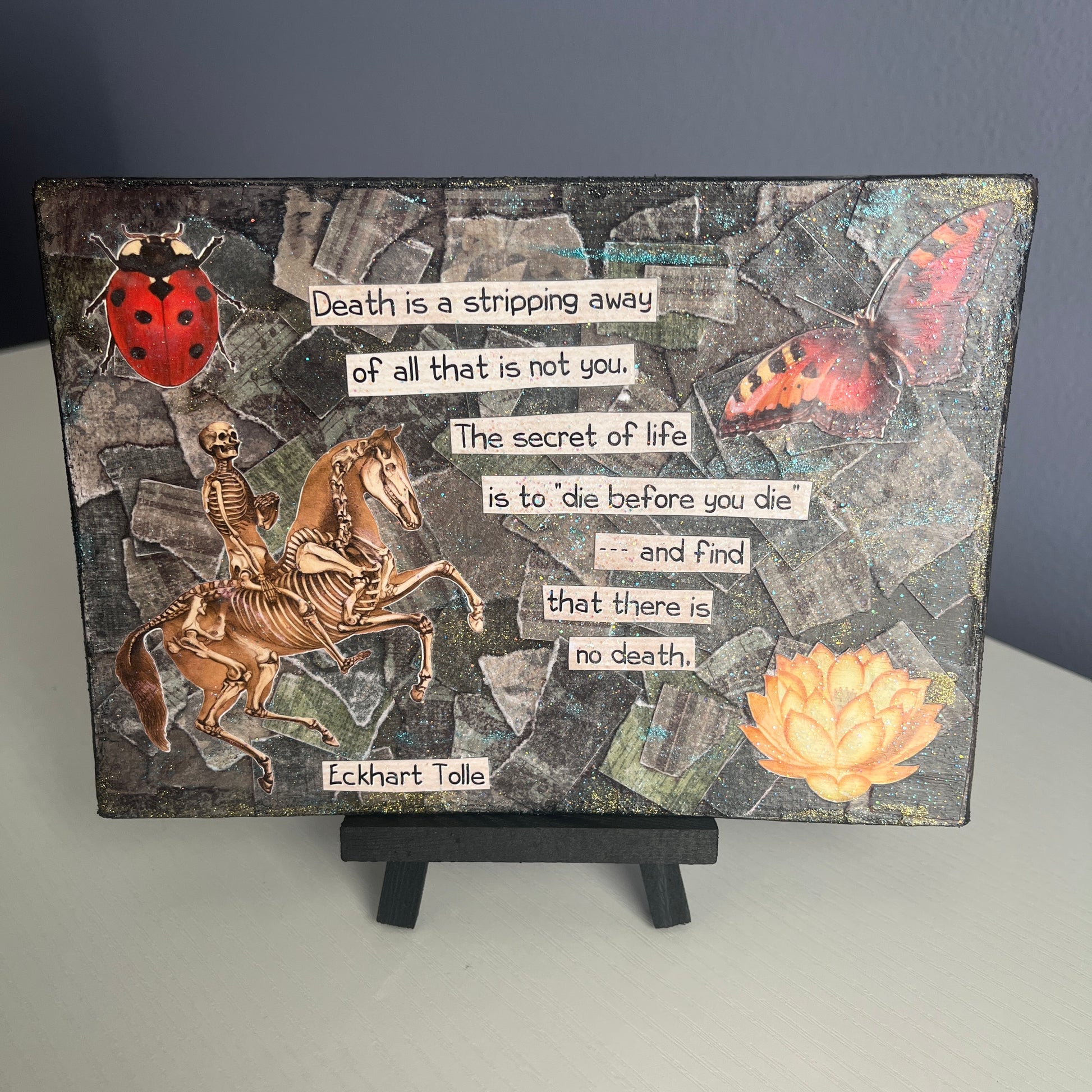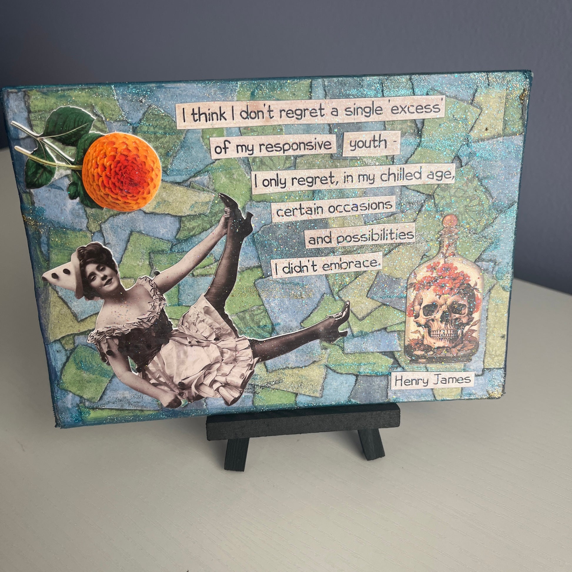 5 x 7 mini art canvases made with torn paper, paint, sparkle and cut outs, featuring my favorite graphics and quotes celebrating a full life and happy death! Each one is signed on the back, finished with a light coat of gloss sparkle, and comes with a 3 x 5 wooden black display easel.